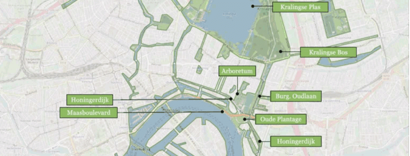 De oude bekende natuurgebieden zijn doorsneden met wegen. De Maasboulevard sluit de (voetgangers)verbinding naar het water/Oude plantage grotendeels af. Hoe zou je dat oude natuur/polderlandschap, met name de Oude Plantage en Trompenburg-Arboretum (en de Esch) met elkaar kunnen verbinden, en wat zouden dan gevolgen zijn voor de infrastructuur zoals de wegen Maasboulevard/ Honingerdijk/ Burgemeester Oudlaan? Moet je alle huidige wegen verbindingen laten bestaan? En hoe gaan die nieuwe (voetgangers)verbindingen er dan uitzien?