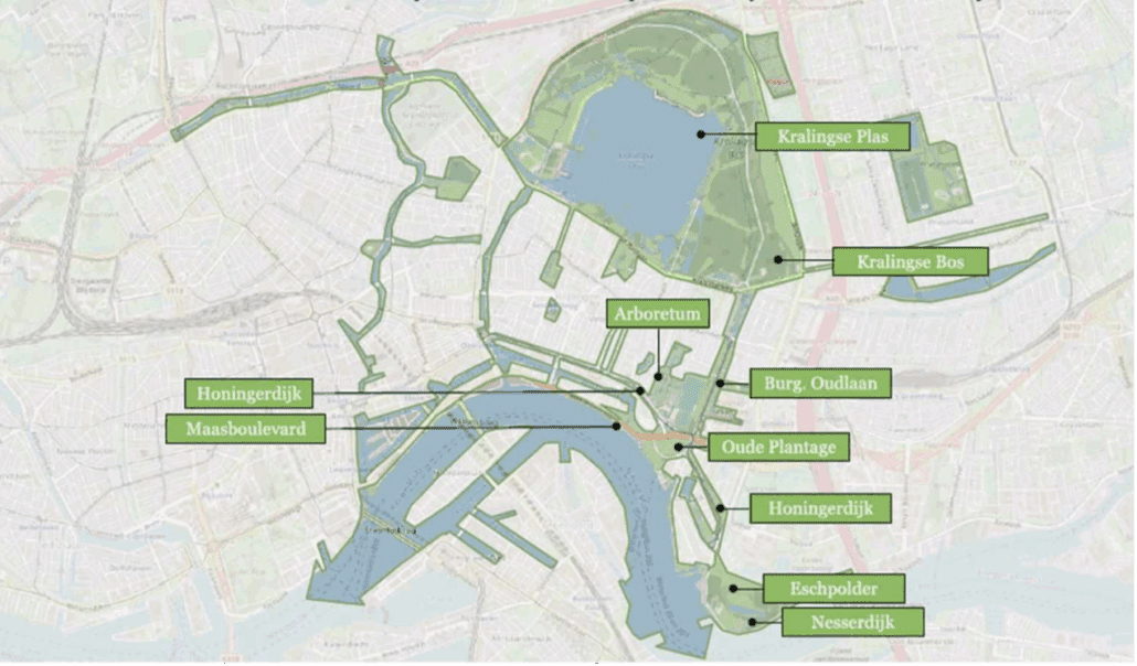 De oude bekende natuurgebieden zijn doorsneden met wegen. De Maasboulevard sluit de (voetgangers)verbinding naar het water/Oude plantage grotendeels af. Hoe zou je dat oude natuur/polderlandschap, met name de Oude Plantage en Trompenburg-Arboretum (en de Esch) met elkaar kunnen verbinden, en wat zouden dan gevolgen zijn voor de infrastructuur zoals de wegen Maasboulevard/ Honingerdijk/ Burgemeester Oudlaan? Moet je alle huidige wegen verbindingen laten bestaan? En hoe gaan die nieuwe (voetgangers)verbindingen er dan uitzien?