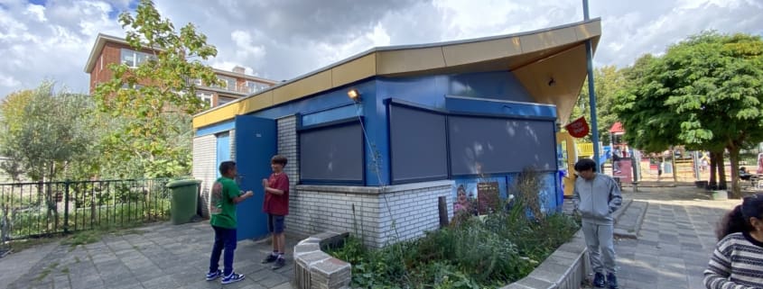 In de nieuwe ontwerptekeningen is alleen geen nieuw ontwerp voor een gebouwtje meegenomen. In het bestaande gebouwtje zit een werkruimte voor de beheerder, er is een grotere binnenruimte voor activiteiten zoals knutselen en kinderfeestjes, een klein winkeltje voor koffie ijs en snoep, en er is een toiletblok. Het staat er al sinds het begin, en is inmiddels gedateerd. De opdrachtgever wil graag een nieuw ontwerp dat meer aansluit bij de wensen van deze tijd.