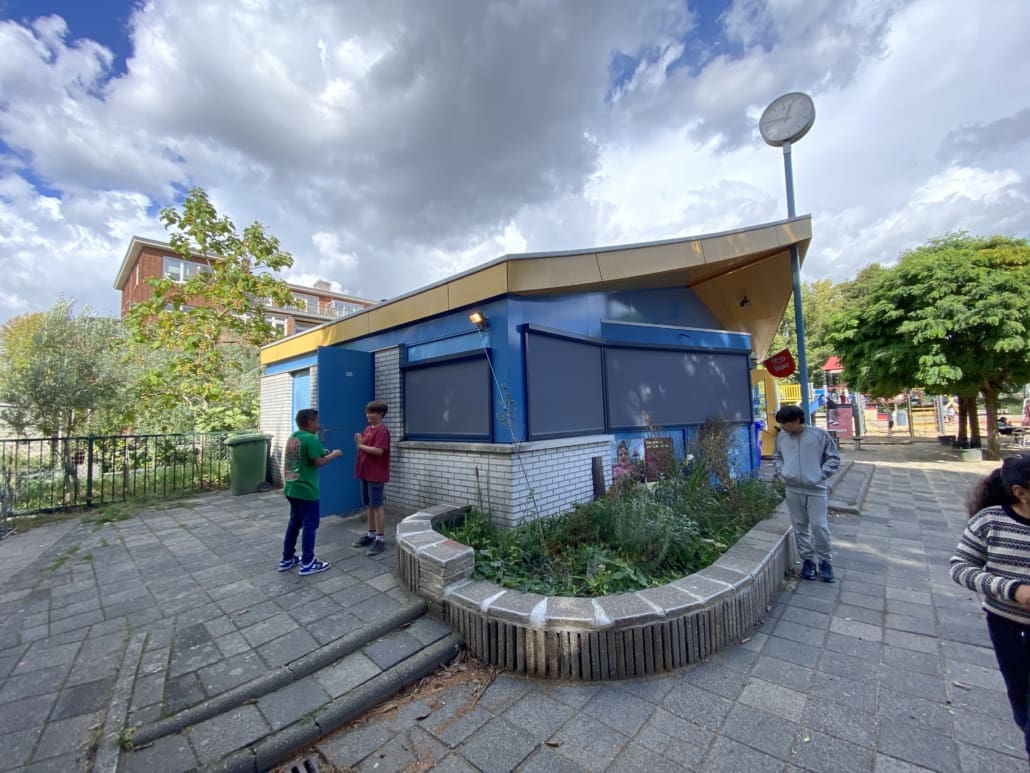 In de nieuwe ontwerptekeningen is alleen geen nieuw ontwerp voor een gebouwtje meegenomen. In het bestaande gebouwtje zit een werkruimte voor de beheerder, er is een grotere binnenruimte voor activiteiten zoals knutselen en kinderfeestjes, een klein winkeltje voor koffie ijs en snoep, en er is een toiletblok. Het staat er al sinds het begin, en is inmiddels gedateerd. De opdrachtgever wil graag een nieuw ontwerp dat meer aansluit bij de wensen van deze tijd.